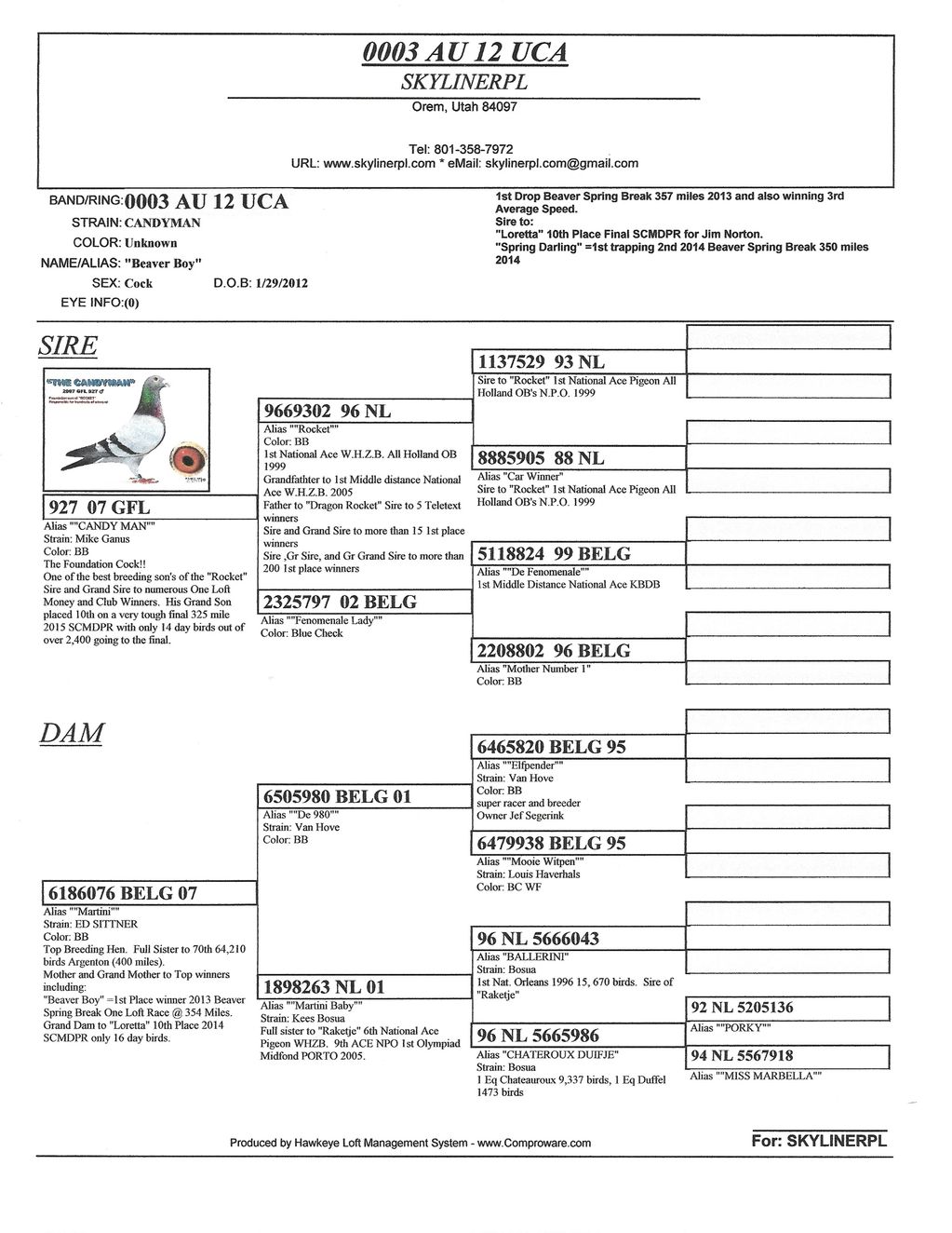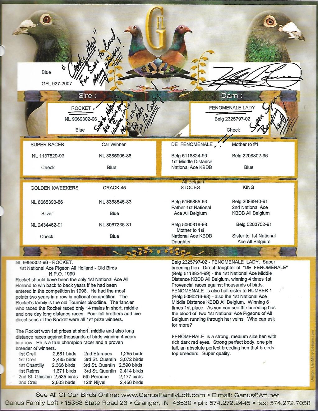 Sire, Gr Sire, and Great Gr Sire to many top racing pigeons!