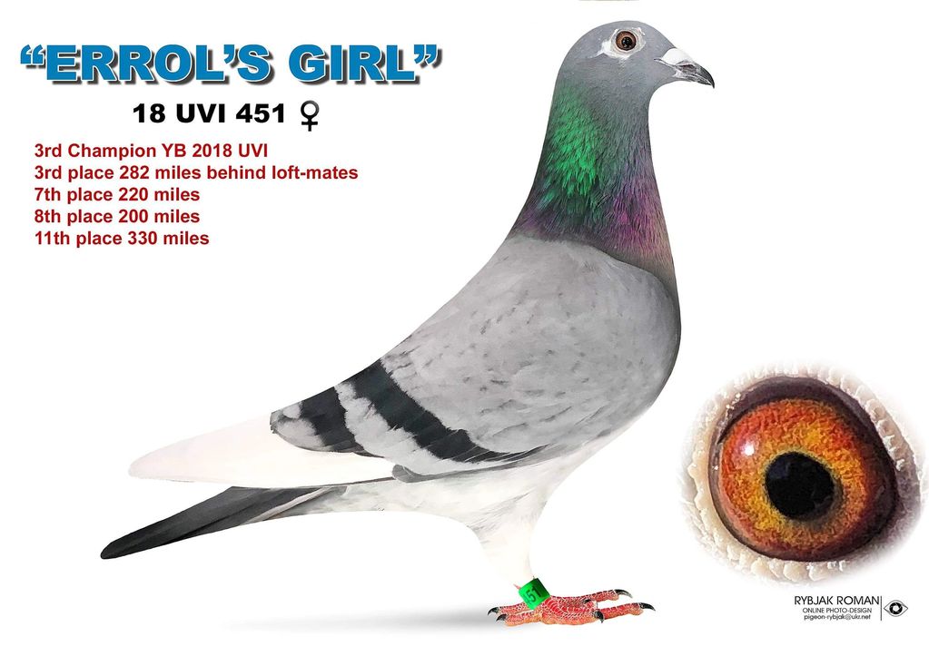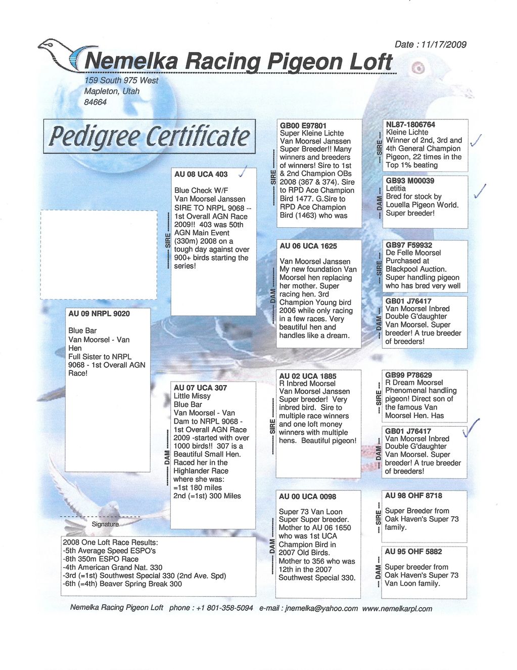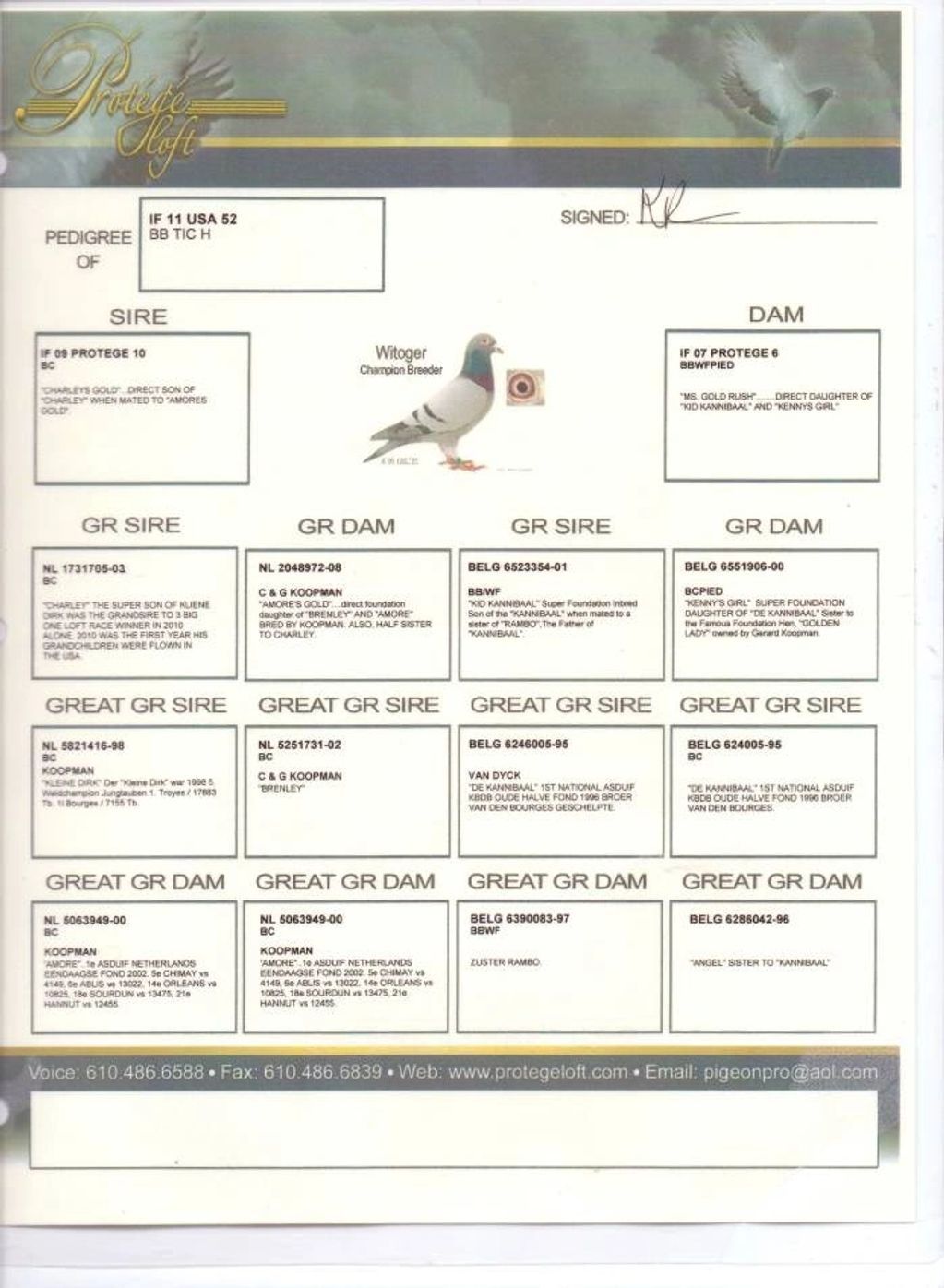 Foundation Daughter of "403" and "307". Dam to over 5 =1st Final Race Winners. Full sister to 1st overall American Grand National One Loft Race. She has bred many big money winners for Sam Haslem especially when she was mated to "Red Storm"